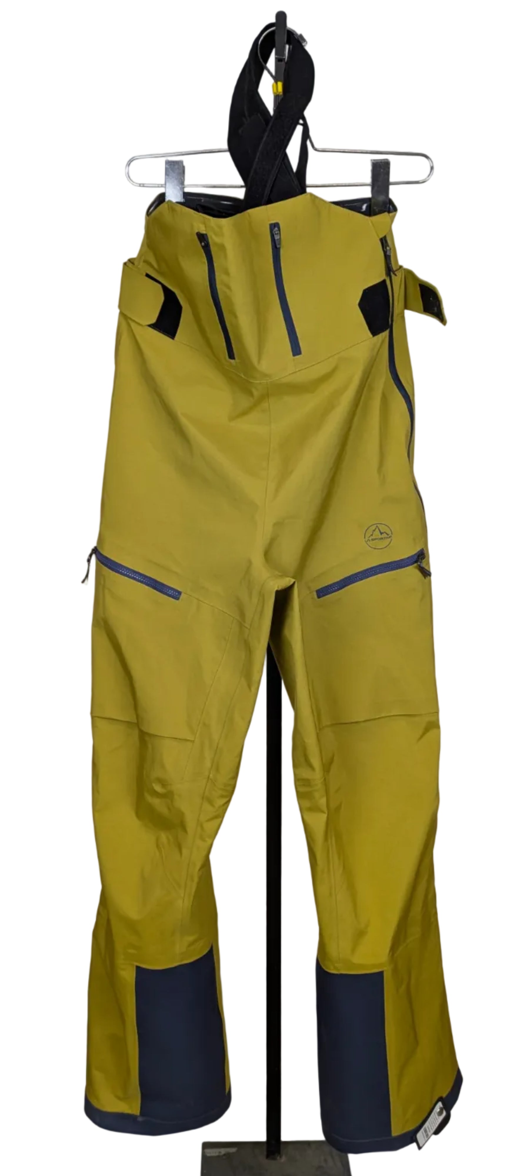 Hit the slopes in style with these LaSportiva ski bibs in striking gold. Designed for serious skiers and riders, they feature integrated suspenders for a secure fit and waterproof zips on the side pockets and main compartments—keeping your essentials dry through powder days and spring slush alike. Built from quality shell material that's ready for whatever the mountain throws at you. Excellent condition and ready to perform.