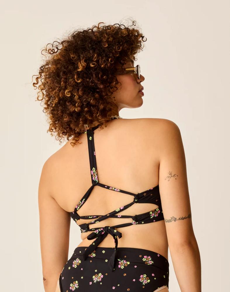 Stylish and fashion forward yet thicker chest band provides support. Halter top with twisted back is adjustable and supportive to all sizes. Similar adjustability and shape as the Stevie Top but with higher bust support