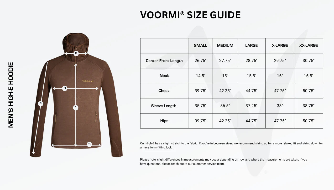 The legendary High-E Hoodie from VOORMI isn't your average sweatshirt. This versatile piece transitions from a breathable midlayer to a weather-protective outer layer, making it a true all-condition companion. Built with innovative SURFACE HARDENED™ Thermal Wool, it keeps you comfortable and dry, while the relaxed fit allows for easy layering.