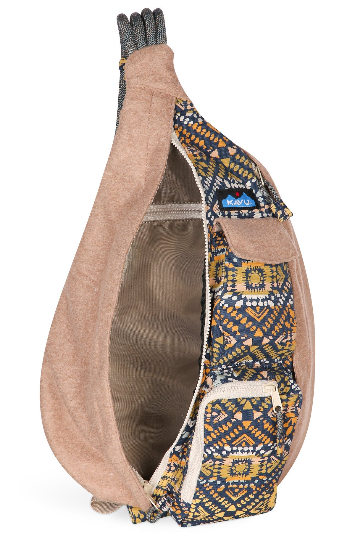 - Sling pack with adjustable rope shoulder strap and side release buckle