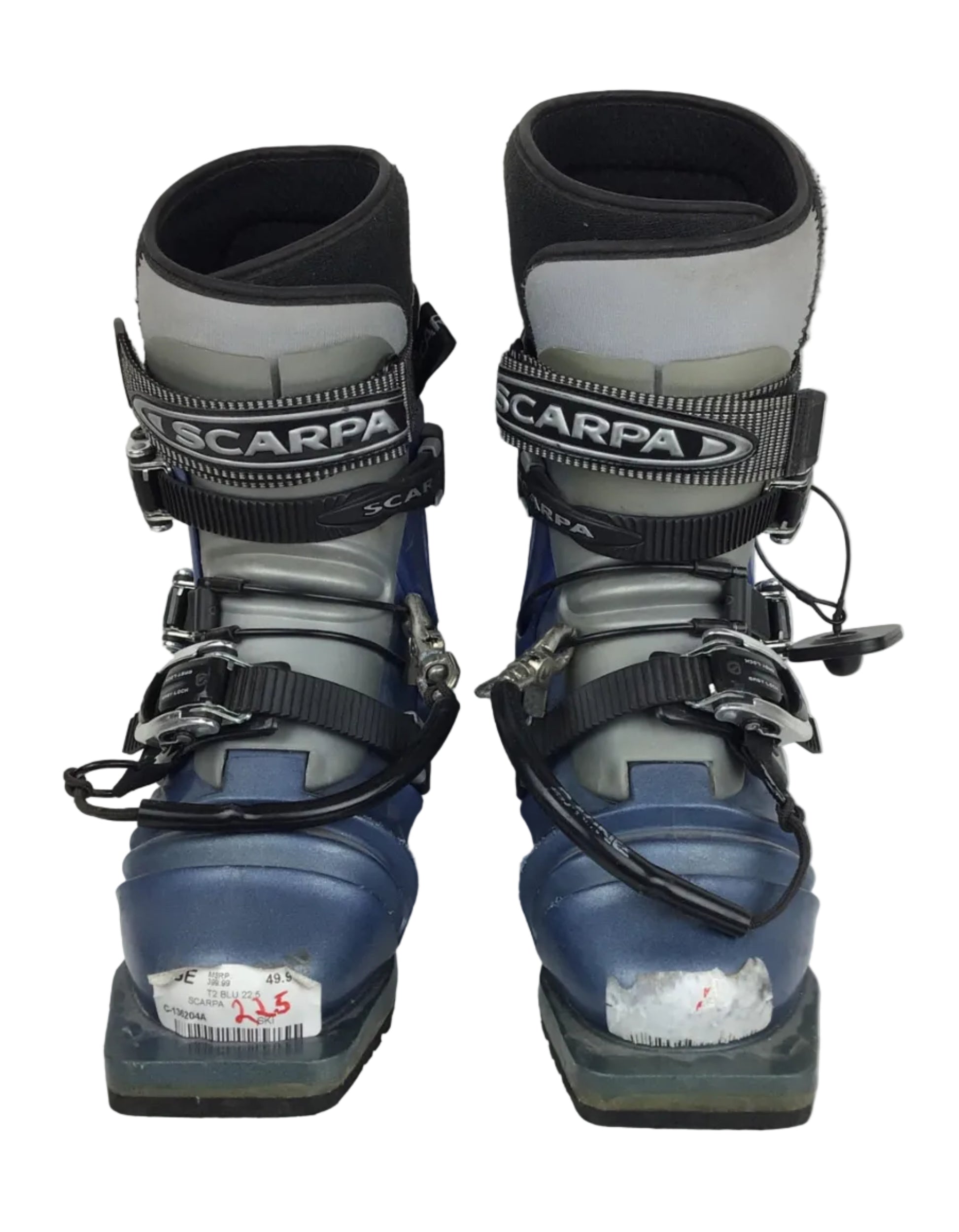 Vintage Scarpa T2 telemark boots in size 22.5 with honest wear marks, dust, and scuffs that tell a story. Ready for your next mountain adventure at a budget-friendly price.