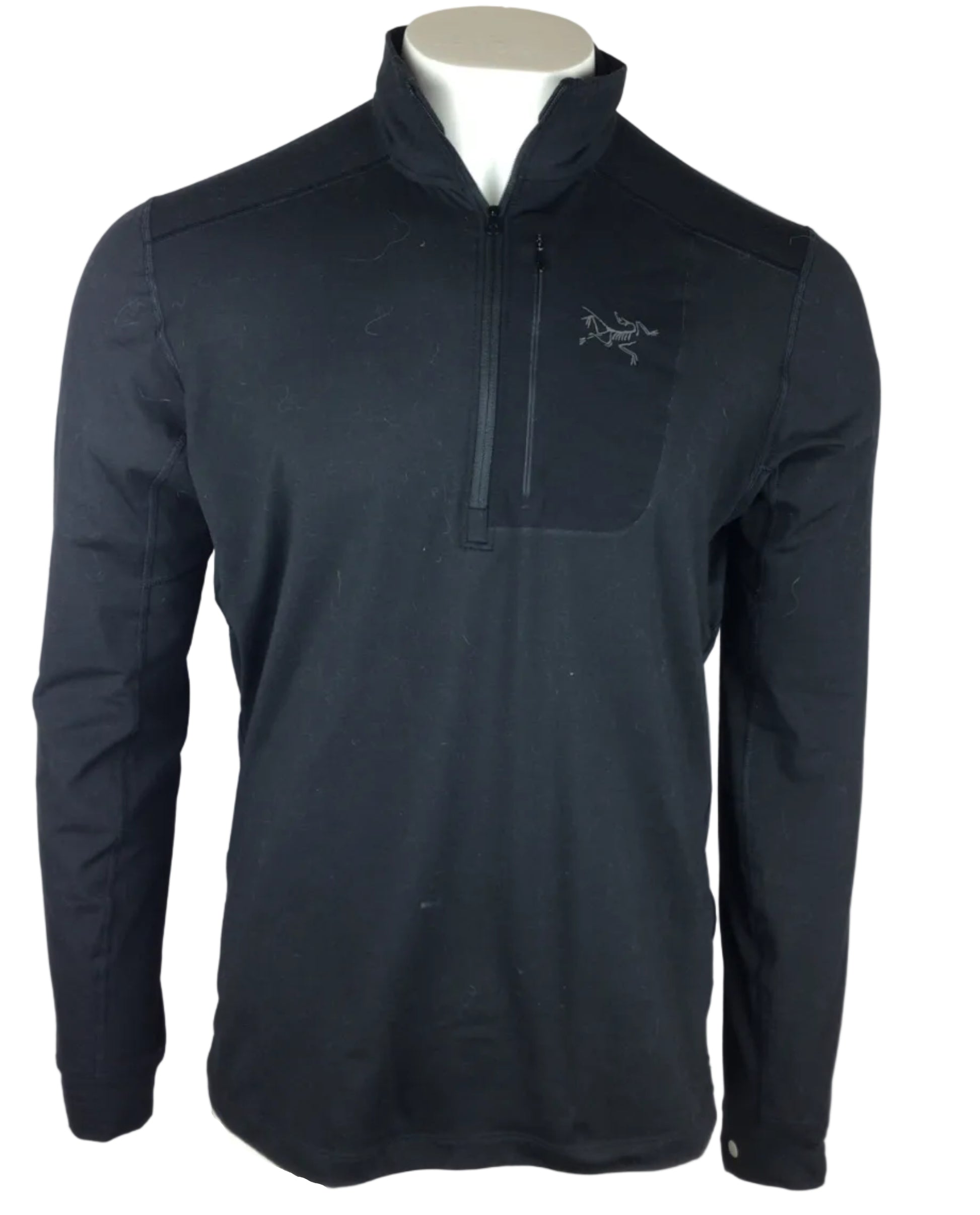 Barely broken in Arc'teryx quarter-zip midlayer in black. This synthetic workhorse wicks moisture and layers like a dream, with just a hint of lint to show it's been out there. Quarter-zip ventilation, fitted cut, ready for your next adventure. Size large.