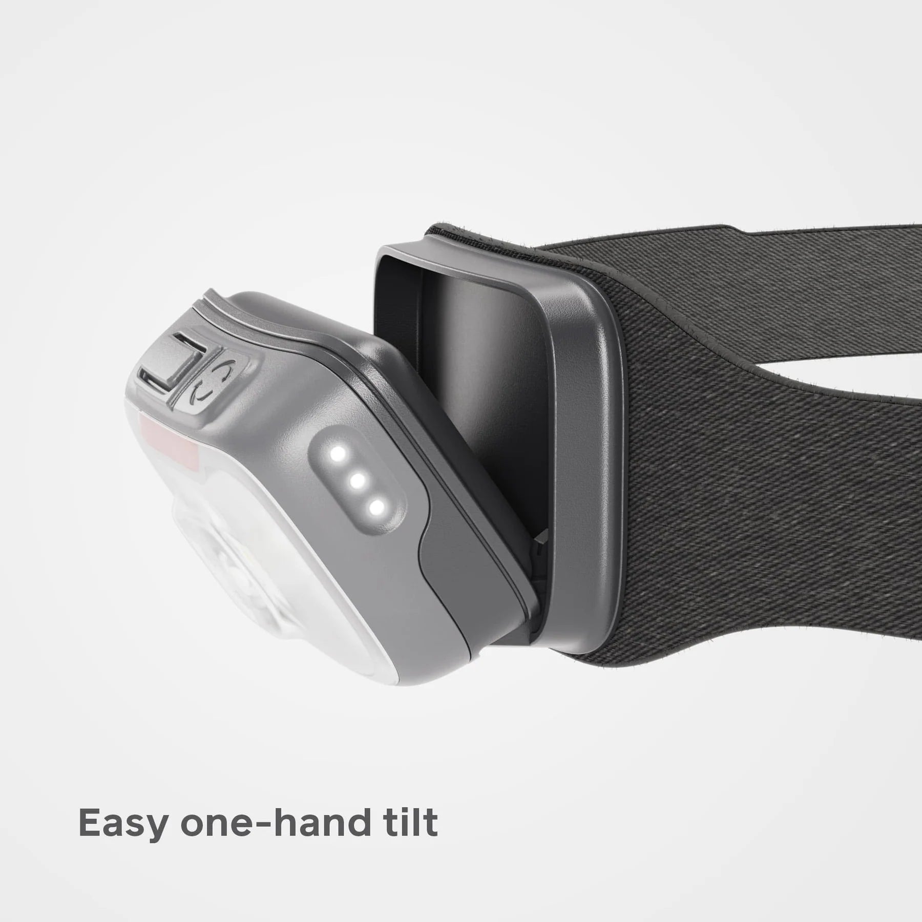 A fast-charging 400 lumen headlamp designed to keep up with life outside. Features white and red lighting modes, IP67 submersible waterproof rating, moisture-wicking band, and easy one-hand tilting. Forgot to charge up? Not a problem. 8 minutes charge adds a full hour of brightness so you can fill up in the time it takes you to get your pack ready!