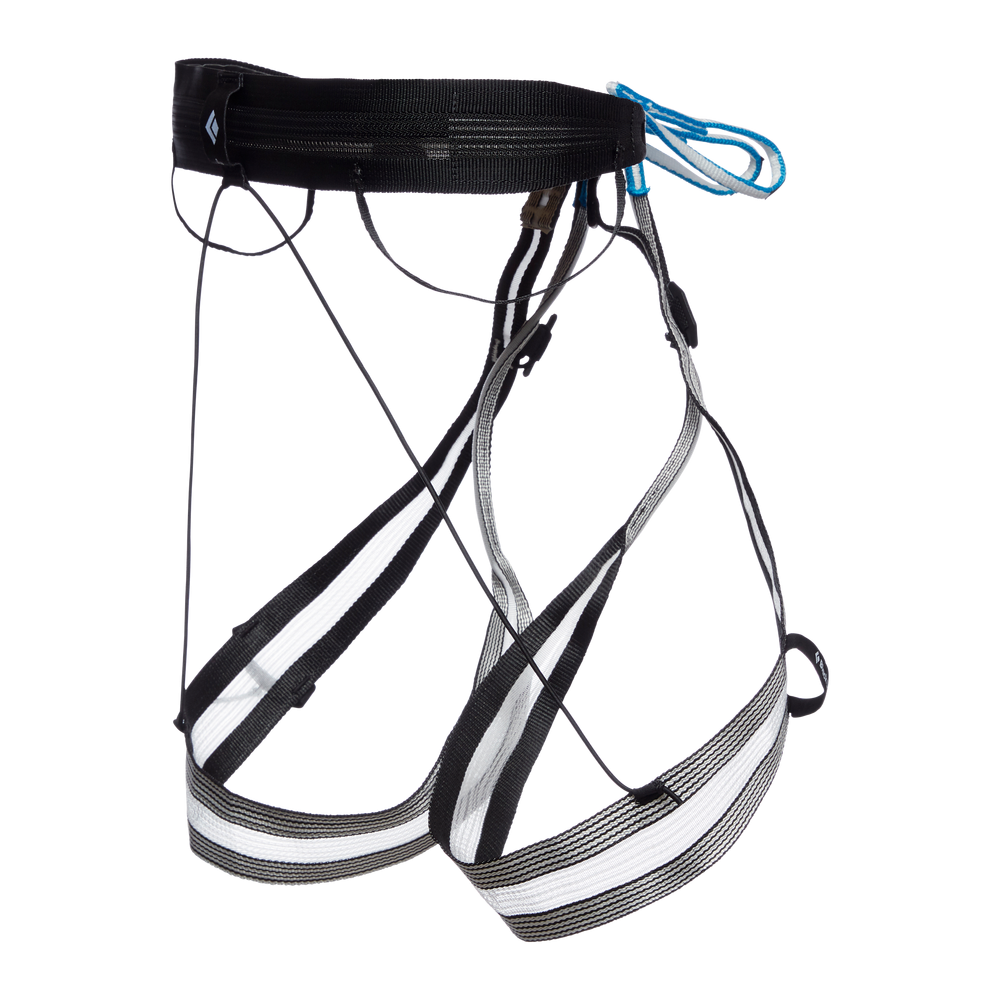 Checking in at just 105 grams, the Couloir UL is built for the weight-conscious alpinist or ski mountaineer. With a buckle-less design, the Couloir UL features rabbit-ear tie-in points, and two webbing gear loops. The low-profile vari-width Dynex monofilament waist and leg loop webbing is highly breathable, and the minimalistic design allow you to put the harness on while wearing crampons or skis.