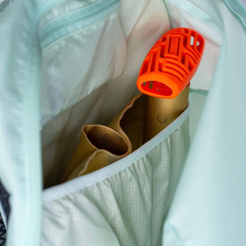Originally designed for ski-mountaineering competitions, this ultra-minimalist pack is the lightest in Blue Ice's category. This pack has been designed specifically for ski-mountaineering competition. With its feather weight of sub 400g, it is also perfectly suited to the needs of all ski touring enthusiasts looking for ultra-fast, efficient transitions. Its ski-carry hook is lockable to secure skis quickly, and a second ski-carrier is available. It also features a reinforced Velcro-zipped compartment for crampons and an ice-axe holder. High-tenacity 100d Ripstop nylon ensures amongst the highest durability that this weight range can offer. A minimalist yet highly functional bag with the best weight/durability ratio. Everything is made to keep you moving without taking the pack off.