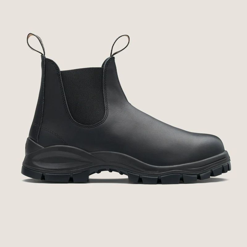 The Blundstone Lug Boot sole's deep grooves are designed specifically to increase traction, making the #2240 in premium black leather a sophisticated option that can handle any environment.