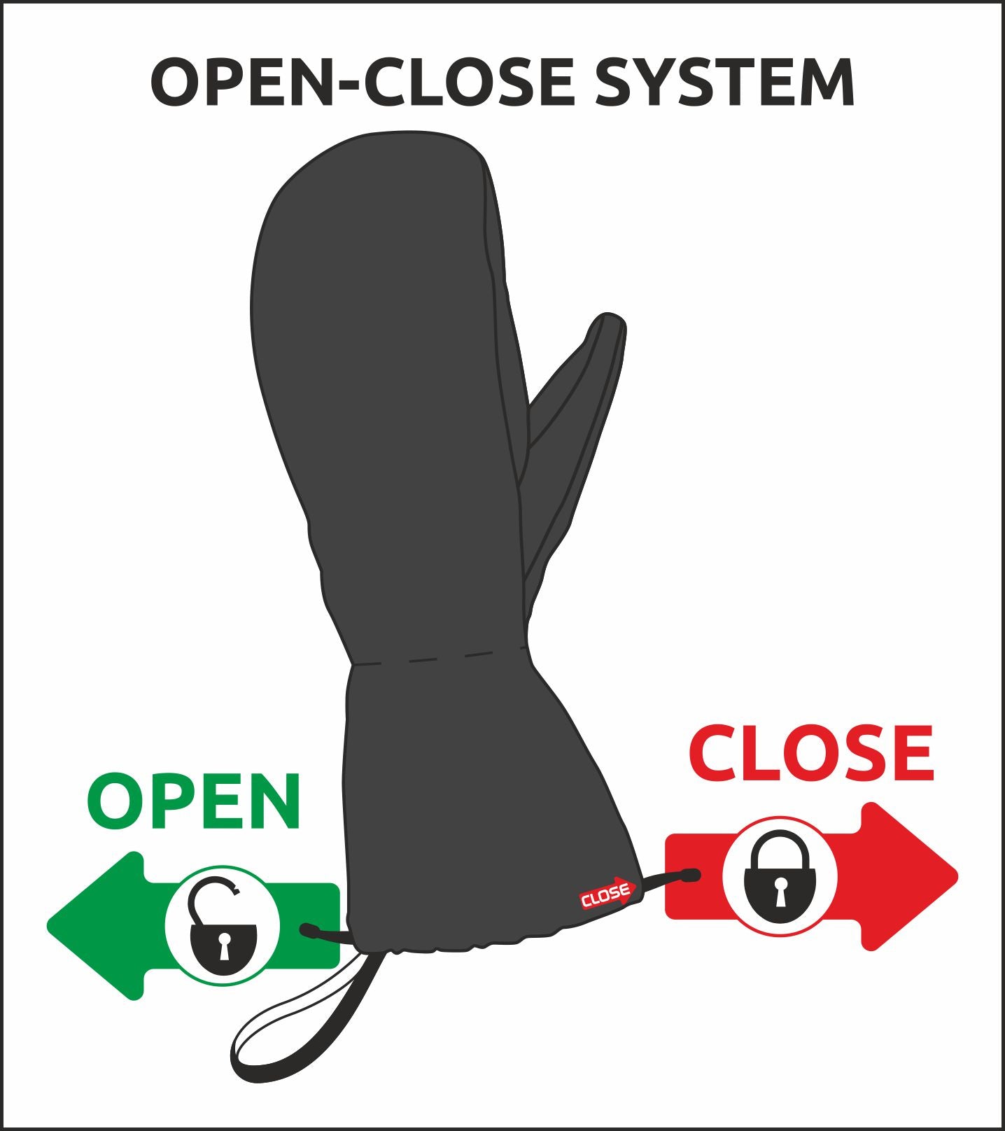 - Full cuff designed to cinch over the sleeves of a jacket with the unique Open-Close system on the wrist that can be operated with one hand – just pull on the Close side to snug it up and the Open side to release and open