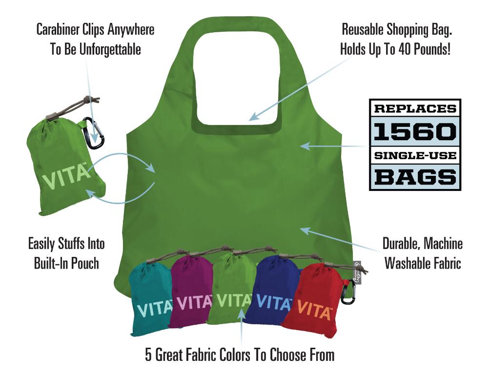 The packable Vita bag replaces 1560 single-use bags throughout its life. The convenient packability is capable of a 40-pound carrying capacity makes it a handy companion to pack along.