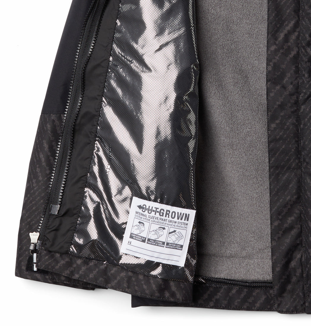 Worn as two separate layers or zipped together, Columbia's classic ski jacket returns with three ways to protect. The fleece layer warms with heat-reflective lining. A waterproof-breathable shell battles snow and rain without letting him overheat. Columbia's OUTGROWN™ system lets you extend the cuffs as he grows for a coat to keep him warm and dry year after year.