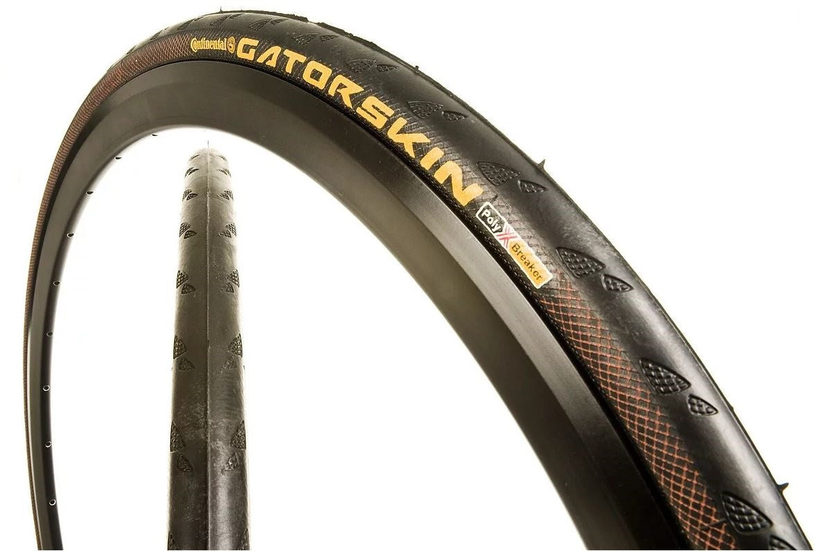 The Continental GatorSkin is a famously durable training, touring, or commuting road tire featuring a combination of three flat-protection technologies. 60 TPI per layer (3 plies for 180 TPI total) in the casing preserves ride feel while remaining tough. Bead-to-bead layer of DuraSkin woven fibers helps prevent cuts, especially in the vulnerable sidewall. PolyX breaker directly under the tread on the Gatorskin adds puncture protection where most flats occur. Continental includes a special high carbon compound for longer tread life. Black tread with black/brown DuraSkin sidewall. Note : Continental has added wear indicators to all Continental Gatorskin tires. These small divots in the tread surface are intentional and are not a sign of a factory defect. Once the rubber wears to the point where the divots are no longer discernible, you'll know it's time to replace it.