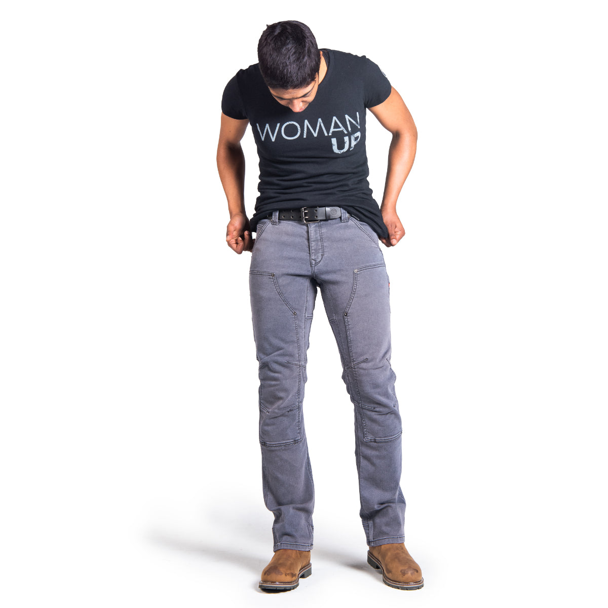 The Britt Utility in grey stretch canvas is Dovetail's new straight-leg fit, relaxed through the hip and leg, with room for boots. This high-performance pant is for the woman who wants a gender-neutral pant on the job. Offered in Dovetail's own custom Dovetail 10 oz stretch duck canvas, proven to be more durable than any other duck canvas on the market, this pant is no mere working stiff. Its gusseted crotch, double front, extra pockets, and articulated knees mean that, just like you, this work pant does more. So yeah, of course the guys are jealous. Kate, the model seen from the waist down without tools, is wearing a size 6/32" inseam. She is 5'7" tall and has a 27" waist and a 38" hip. Her natural inseam is 30". Britt, the model seen here with the tools and hat, is wearing a size 2/32" inseam. She is 5'4" tall and has a 28" waist and a 37" hip. Her natural inseam is 31".