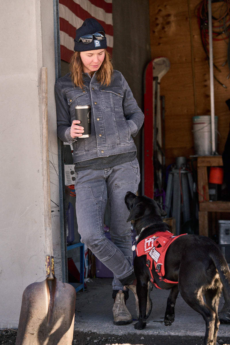 What if your favorite slim-fit jeans also kept you warm? Maven X has gone thermal, and these fleeced jeans are the warm work pants for women. Here's the thing: women want insulated jeans, but without bulk. Or as Dovetail says, liners are for panties, not pants! How does Dovetail retain the flattering fit of their Maven X pant and combat Numb Bum Syndrome? An all-in-one hybrid denim, not denim with a fleece lining glued into it: One fabric, two faces. Which means tough denim on the outside, but fleeced and snuggly on the skin.