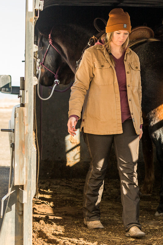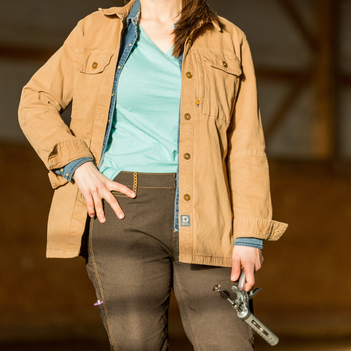That jacket you always had to go to the men's section for? Dovetail made it for you. Rugged, but not bulky, the Oahe Work Jac is the perfect midweight layering piece. Oahe is the Lakota word for "foundation"—a name suggested by the women of the Lakota-owned DX Ranch in South Dakota. The Oahe Work Jac rounds out Dovetail's DX Ranch collection: foundational pieces that bring performance to the range, but feel at home in the city. Laid back but stocked up, the all-purpose Oahe crosses all terrain. Earthy canvas goes with everything. 7 pockets go for miles. Oversized girlfriend fit sits easy, but subtle tailoring steers clear of frumpy. Layer up, ride on.