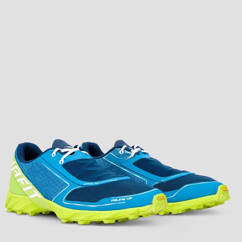 Very lightweight Vertical Running shoe for steep and rocky trails. Lightness, traction and feedback. Feline Vertical has been engineered for fast off-trail runs of short- and medium-distance on rough terrain with steep gradients, mud and rock. The revolutionary design of the lugs, combined with Megagrip by Vibram®, provide outstanding grip on wet surfaces and continual perception of good friction under foot, enabling the runner to exploit 100% of the power provided by the legs. The reduced-drop midsole, combined with the foot-hugging Minimal Fit system produce an ultra-lightweight, reactive and precise shoe which is ideal for ambitious athletes tackling short- and medium-distances, in races as well as training runs.