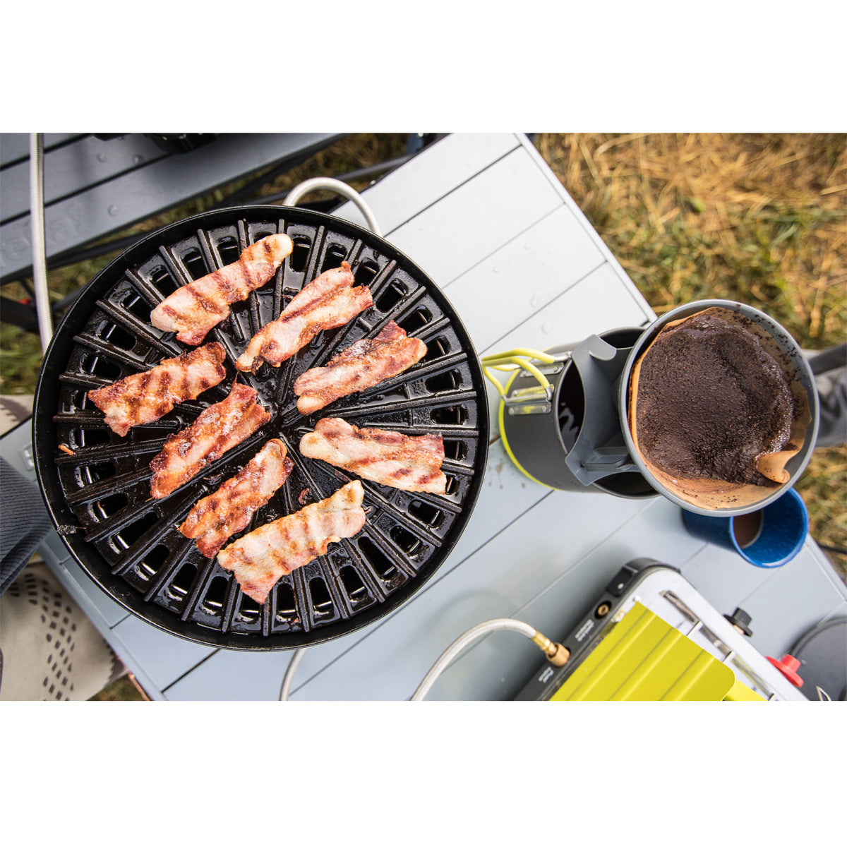 - Large, hard-top table design is ideal for campsite tasks or fun
