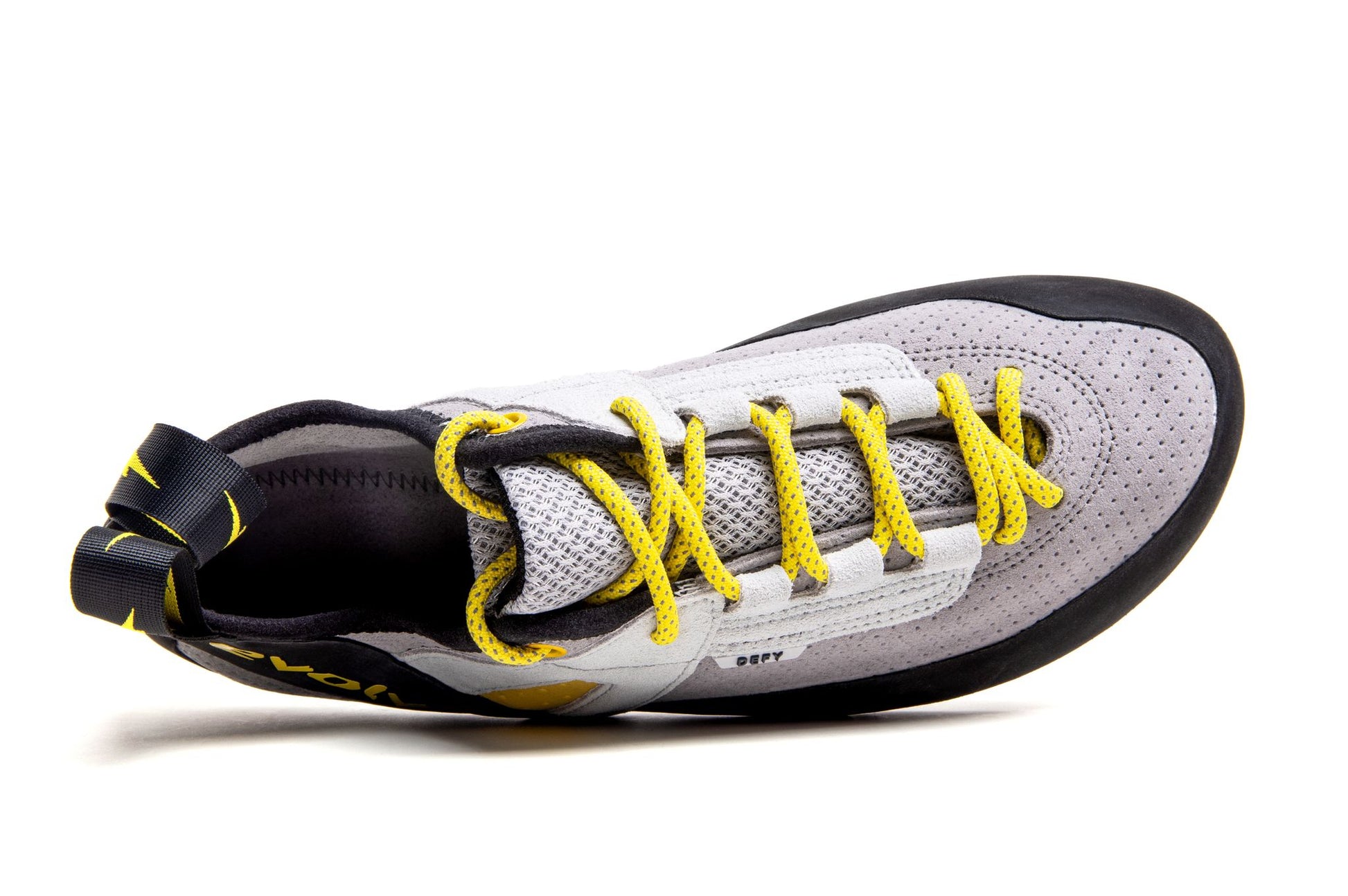 The Defy Lace was designed for the climber that has comfort and all-around moderate performance in mind. The single layer leather, which features a semi perforated upper, allows the shoe to melt and mold to your foot giving that custom fit, while ensuring that the shoe does not lose structure; the perforations do not actually penetrate the upper. The 3/4 length speed lace closure will ensure that you can sinch the shoe up quickly when you need to add a little more performance and drive some extra power to your toes. The 1.2 mm full-length midsole paired with a slightly asymmetric toe profile will give you a sturdy enough platform to edge on vertical faces or provide enough confidence for your off vertical endeavors.
