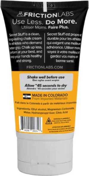 Less dust, less mess and cleaner hands—the Friction Labs Secret Stuff Hygienic 80% Alcohol liquid chalk goes on easy to provide excellent grip while helping reduce the spread of germs.