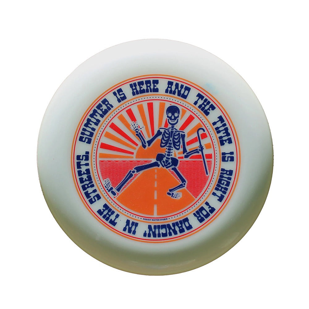 The Dancin' Disc is Funn & Frolic's first poster art frisbee. They mistakenly limited the run to 250 so you can consider this a "2nd printing" of sorts. Drew Findley at Subject Matter Studio in Asheville did this design. This is an 11inch diameter 175gm glow disc perfect for a day in the park or a competitive ultimate game.