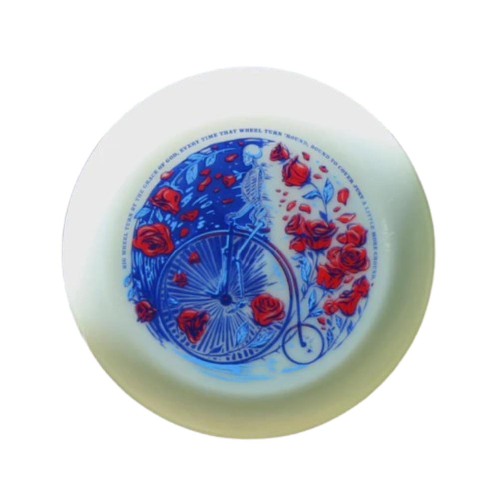 The Funn & Frolic The Wheel has been a couple years in the making and they super excited to release it! Nothing compared to hearing Garcia start to noodle those opening chords drums/space -> the wheel. This is an 11inch diameter 175gm glow disc perfect for a day in the park or a competitive ultimate game.