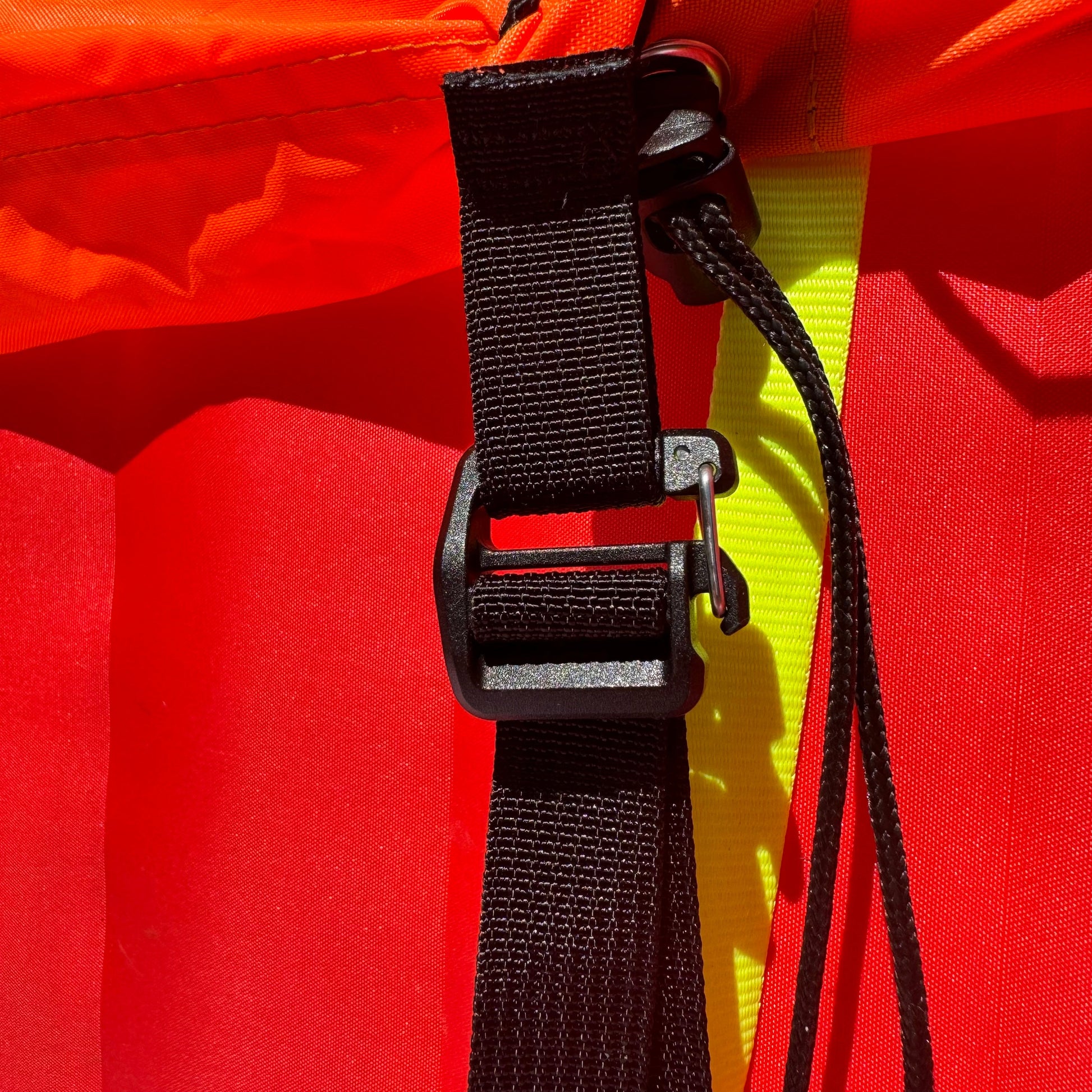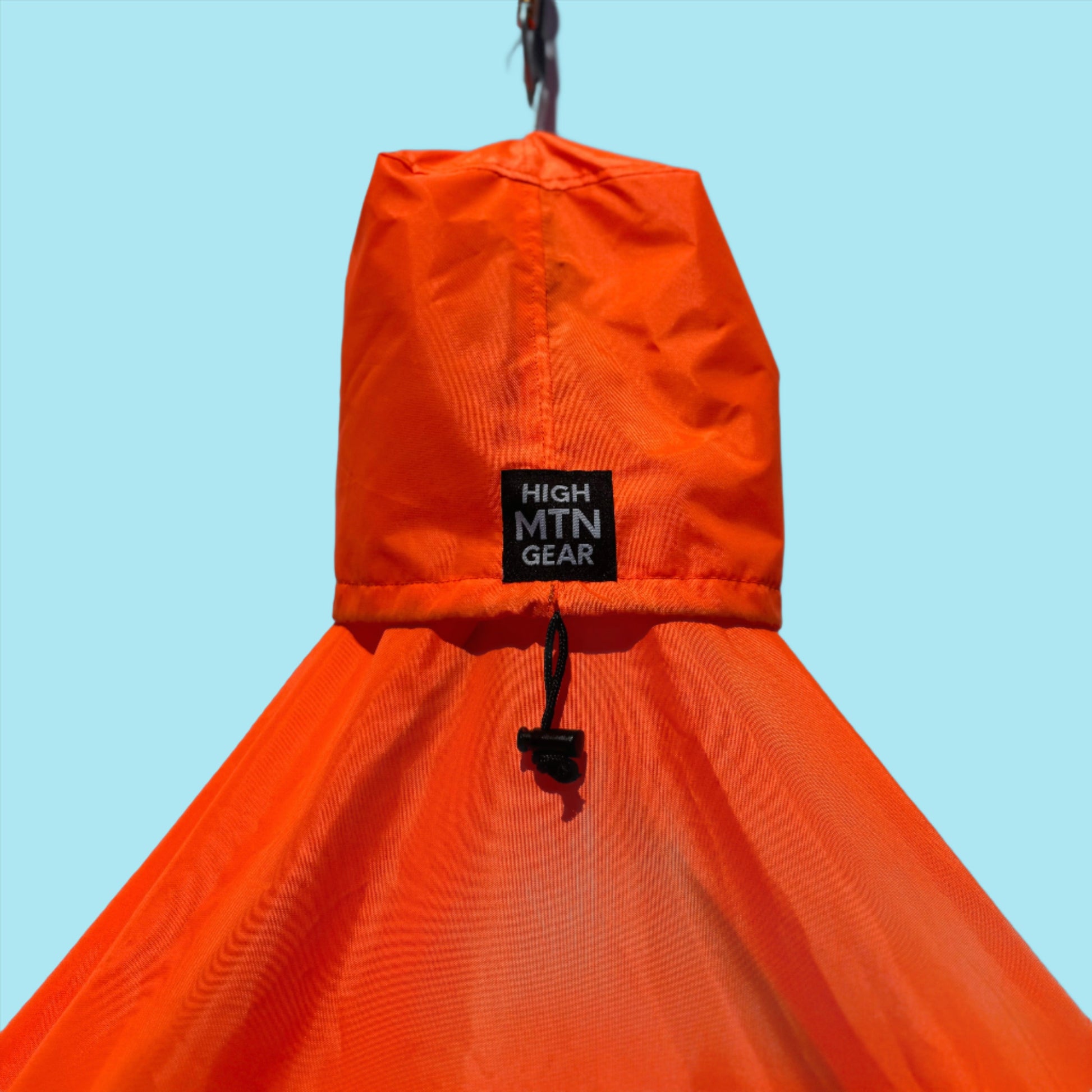 The bottom secures around the bottom of the Pod with elastic cordage and a cinch cord, and a removable buckle cinch to batten down the hatches. It is also possible to “guy out” all the edges with bartacked tabs for use on the ground to your objective and an overhead anchor point.