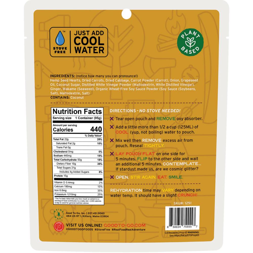 A power bowl is a complete meal filled with simple, healthy ingredients. Good To Go's begins with a base of hemp hearts, topped with carrots, wakame (seaweed) and cabbage. But it's the flavorful carrot-ginger dressing that takes it to new heights. Chef Jen's inspiration for this dish dates to her childhood, when she fell in love with the carrot-ginger dressing at a Japanese restaurant in her hometown—some things just stay with you. Best of all, no stove required! All you need is cool water to enjoy a delicious meal created by an award-winning chef, in the backcountry, on the road, or wherever life takes you.