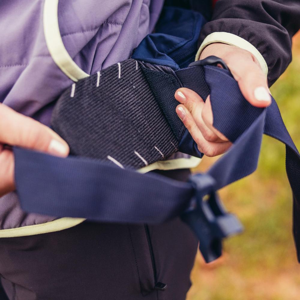 - Perforated, breathable shoulder harness with sternum strap featuring an integrated safety whistle