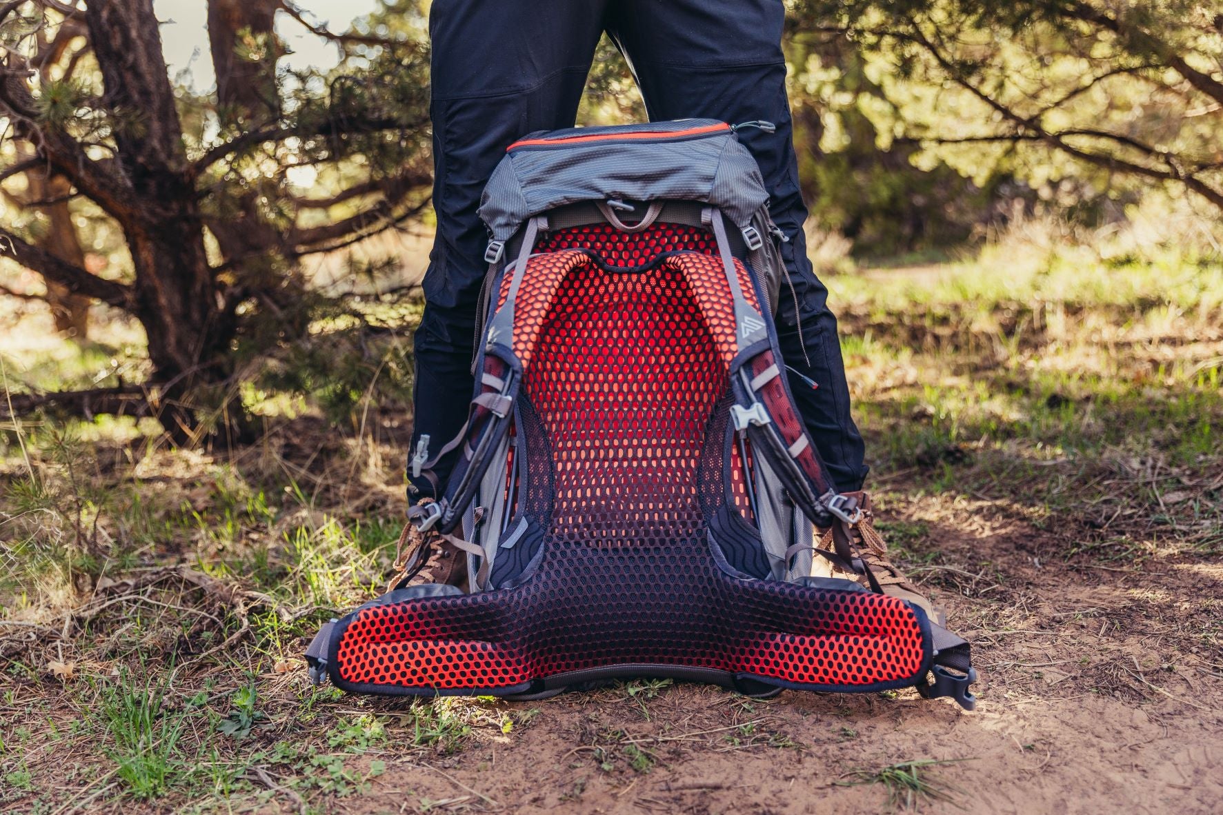 - Side stretch-mesh pockets with side trail access and pass-through for over-or-under compression