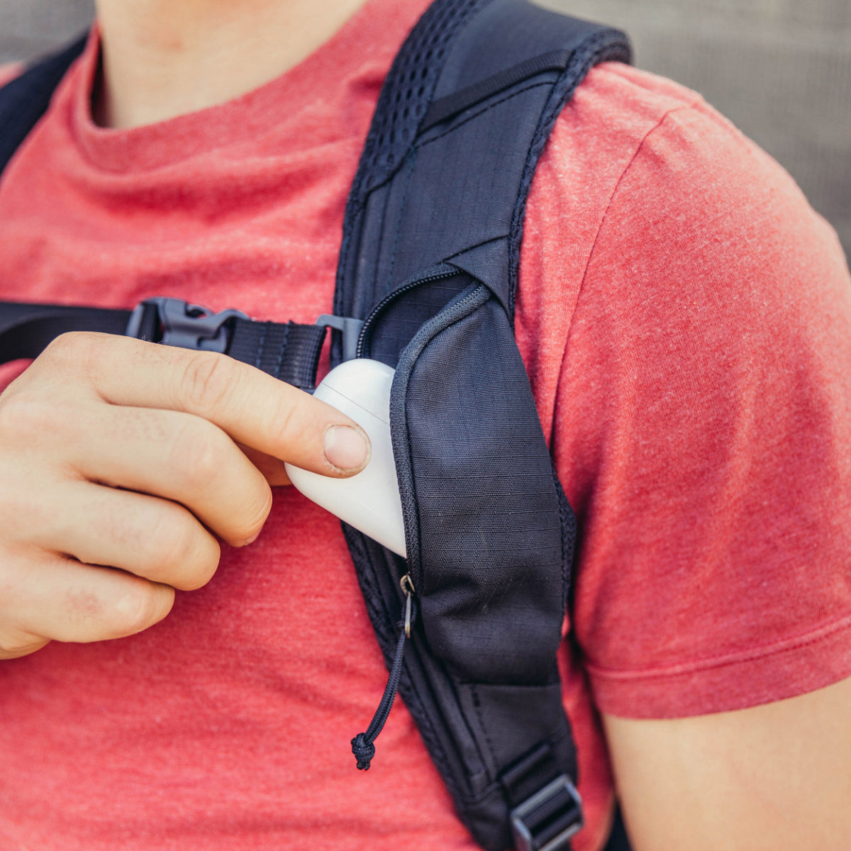 Digi harness pocket perfectly fits earbuds, transit passes, chapstick, and other daily essentials and keeps them secure and easy to access