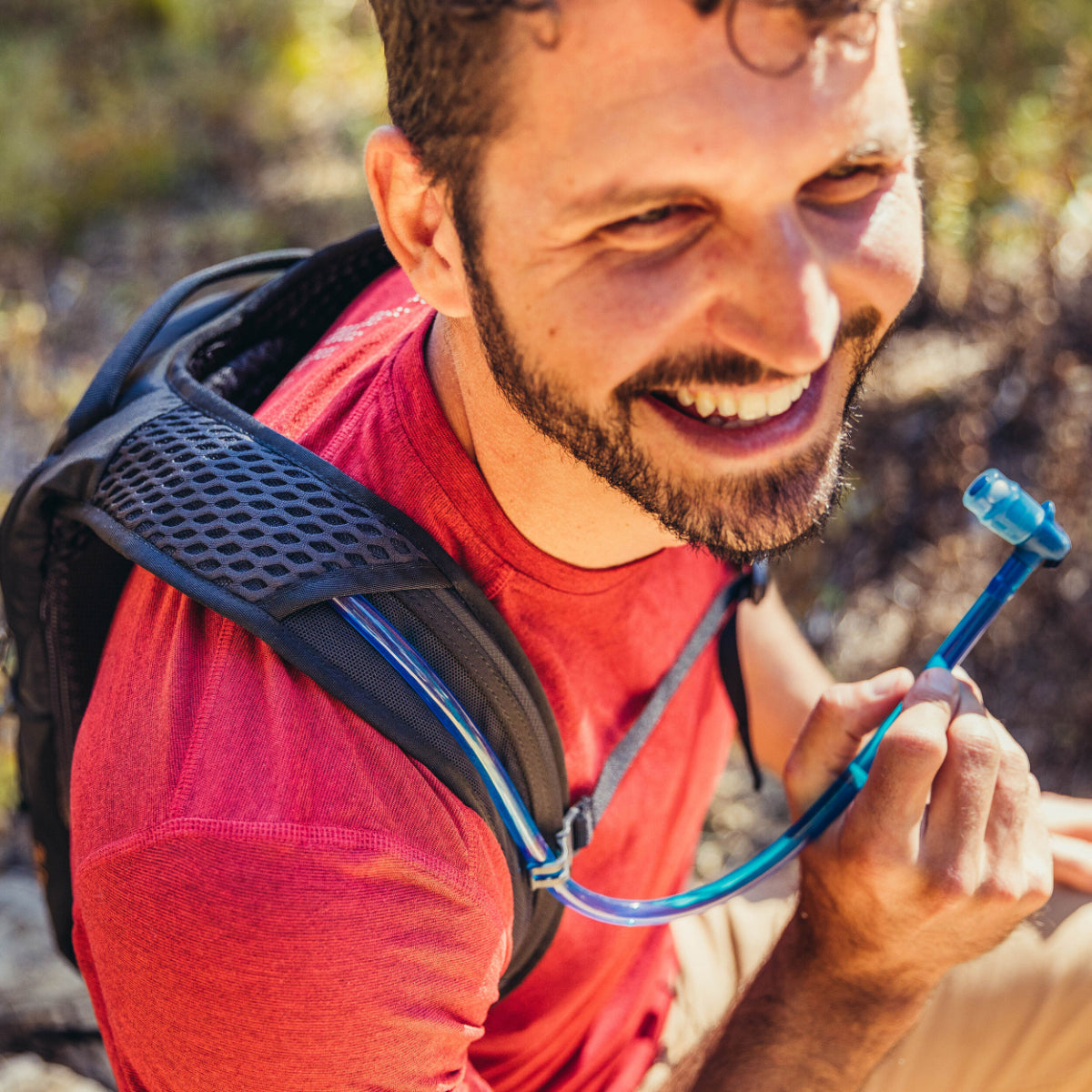 - Perforated, breathable shoulder harness with integrated magnetic sternum strap buckle to quickly detach and reattach the reservoir bite valve