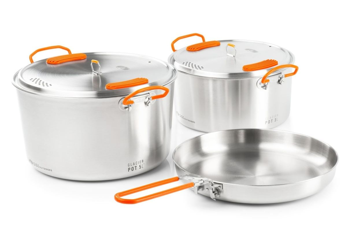 GSI Outdoors's Big Kahuna stainless steel base camp set is built strong, heats efficiently and evenly, and handles meals for four - or more - people. Tough enough for cooking over open flame or red-hot coals, the 5L pot makes tons of pasta, the 3L pot handles cooks up a bunch of soup or stew, and the big frying pan wrangles big breakfasts. Strainer Lids make draining safe and easy, and dual bail handles on the pots give you sure, secure hold. And - since it's all stainless steel - it handles years of abuse, cooks evenly and efficiently, and cleans up easily. Plus, it all nests into a mesh stuff sack for low-footprint travel.