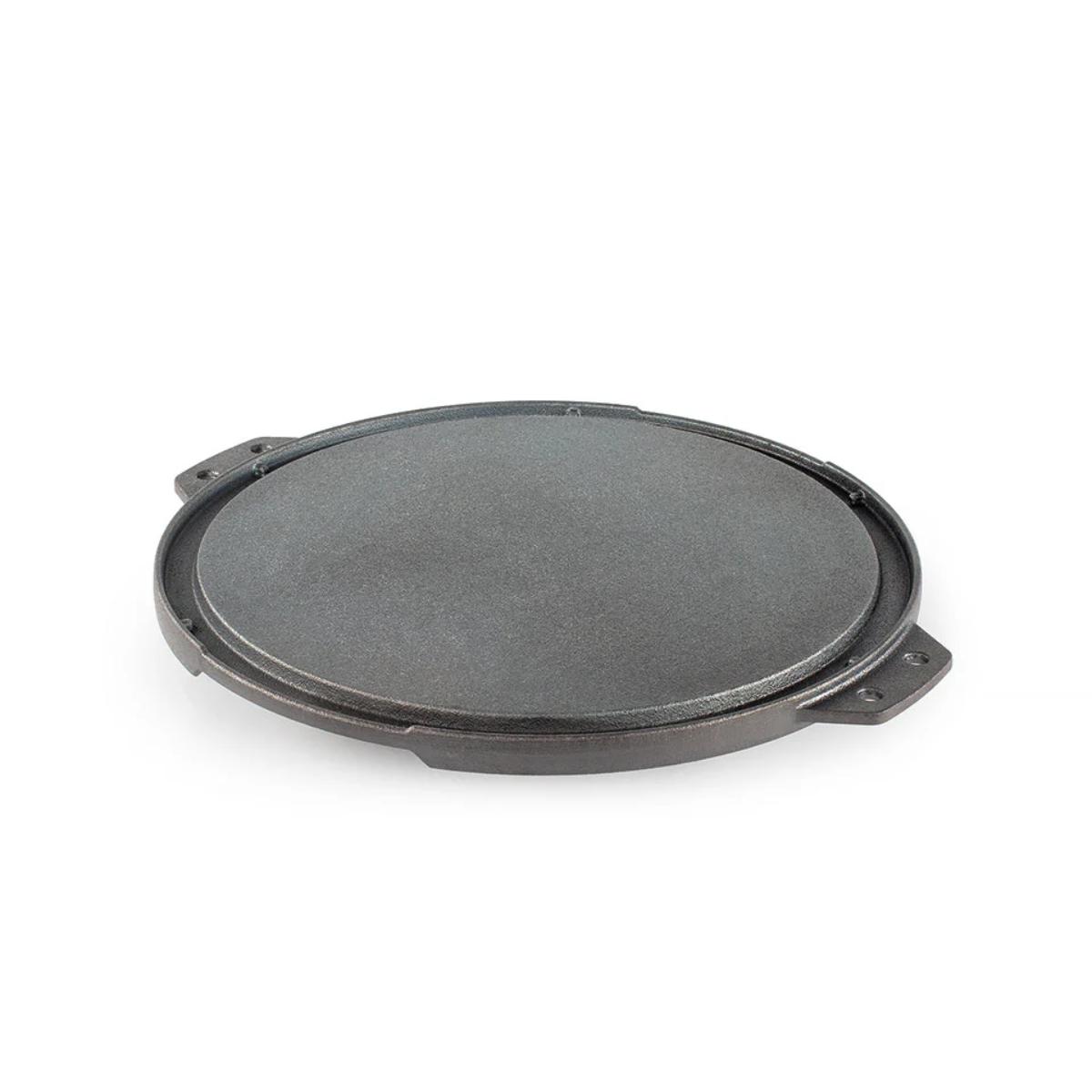 Dual-sided, pre-seasoned cast iron griddle / grill integrates for use with other Guidecast products. Wire handles allow safe handing.