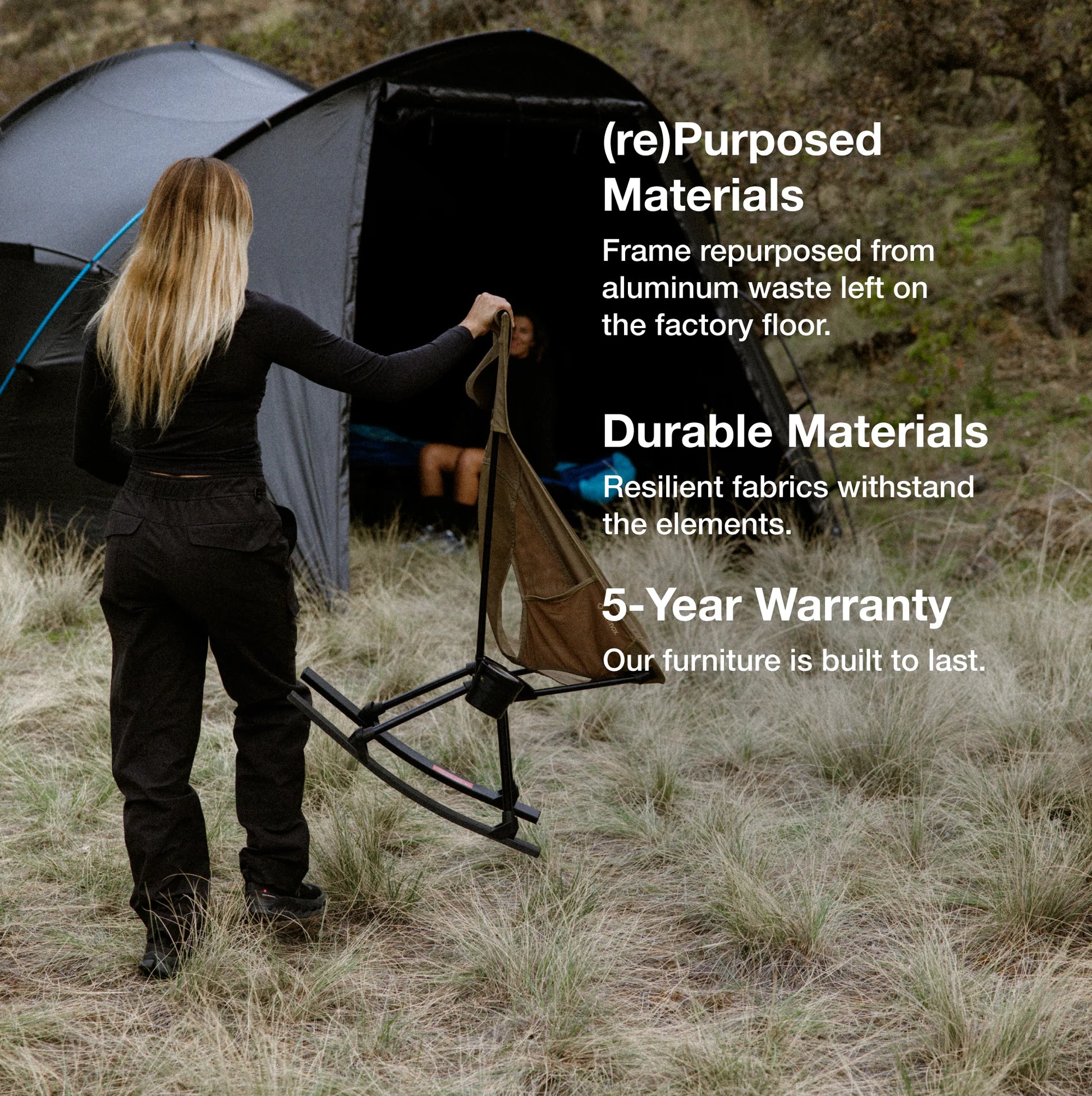 - The Sunset Chair (re) frame is made from repurposed aluminum shavings once destined for the landfill and refined into alloy discs. The result: reduced waste and a lower environmental impact