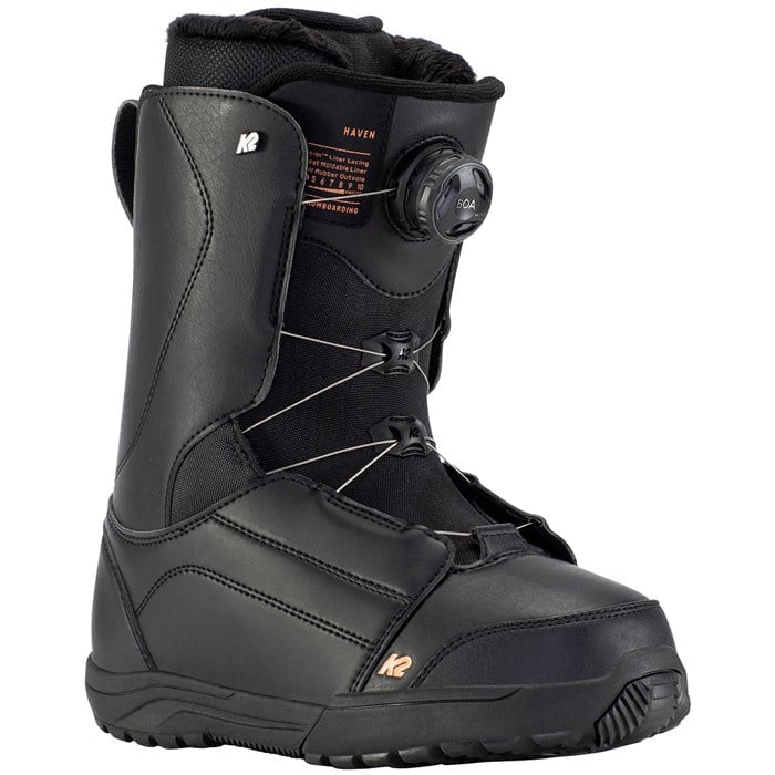 The Haven is a staple in the K2 Snowboarding boot line and is the perfect all-mountain option for boarders who want a softer flexing boot with deluxe features for exploring new terrain. A long-time favorite of resort employees and progressing snowboarders alike, we packed all of the essentials into the mix on the K2 Haven, starting with an H4 Coiler BOA® Fit System. This securely closes the shell using a stainless steel BOA® lace for the perfect fit and helps to effortlessly get you in and out of your boots at the beginning and end of the day. Next, K2 added Fast-In liner lacing to maximize fit and keep the liner snug against the contours of your feet. No matter the shape of your foot, the ultra-warm, heat-moldable, and breathable Intuition® Comfort Foam 3D liner hugs every nook and cranny for a great fit out of the box. To increase responsiveness when turning, we added internal and external j-bars to the liner, wrapping your ankles with support and cushion, and added an EVA footbed for comfort. K2 built the whole thing on a grippy, lightweight rubber outsole for hiking and exploring new terrain, and filled the midsole with our proprietary Harshmellow™ foam, helping to increase impact absorption and help dampen vibration underfoot.