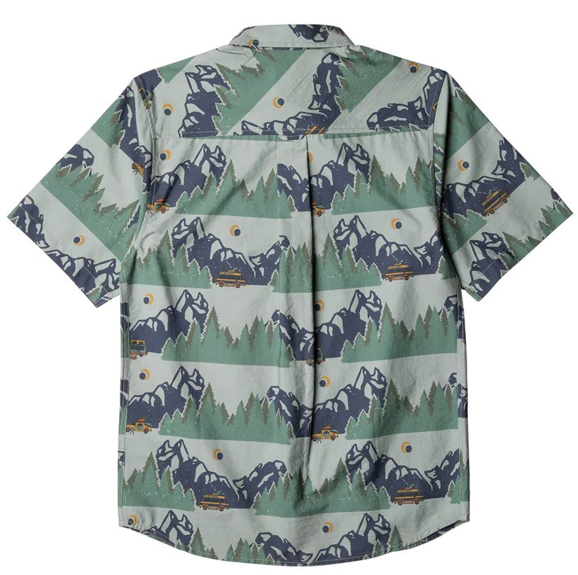 Kavu's The Jam Shirt is a casual fit, short sleeve button-up shirt with a stand collar, single chest pocket, dyed to match pearlized buttons with satin finish, back yoke panel with box pleat and locker loop, and a curved hem.