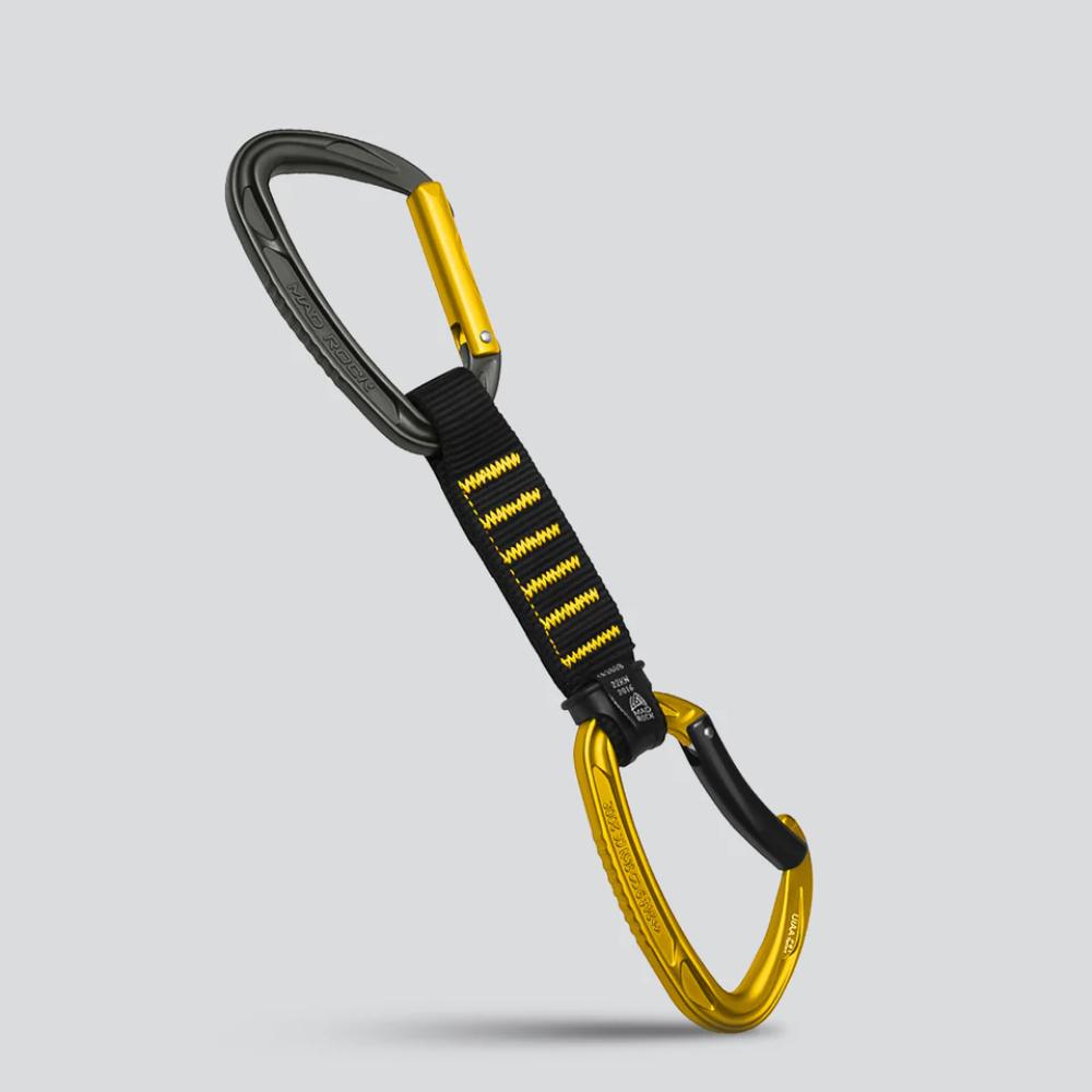 The Mad Rock Bottlenose 4 inch Quickdraw Express set comes in a pack of 6. A notchless key lock gates on both carabiners along with a narrow nose profile make this on of the easiest quickdraws to clip both the hanger and the rope. Additional grooves along the spine gives confident feedback when handling either carabiners as well. The wide stiff sling also makes for a comfortable grip when pulled.