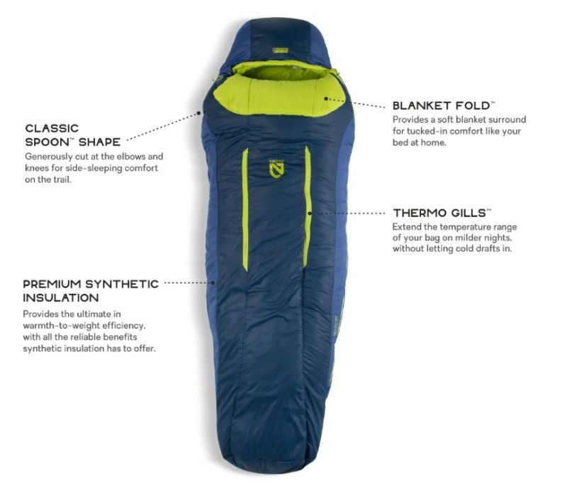 Seventy percent of people sleep on their side, yet mummy bags are not designed to accommodate this. Forte has been updated with Primaloft's lightweight, ultra-lofty and supremely resilient RISE insulation featuring 80% post-consumer recycled content. Forte's classic Spoon™ shape provides a generous cut at the elbows and knees so side sleepers can shift positions comfortably throughout the night. These 3-season backpacking bags are loaded with features, including Thermo Gill™ vents that help regulate temperature during the night, a Blanket Fold™ draft collar that provides tucked-in comfort, an integrated pillow pocket, and a waterproof/breathable footbox to withstand tent condensation. Left-sided zippers on the men's and right-sided zippers on on the women's styles allow two Fortes to zip together for a double version of these favorite synthetic sleeping bags.