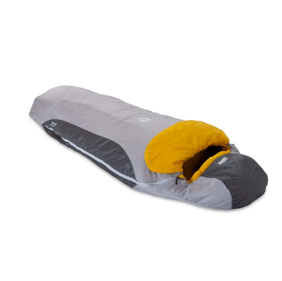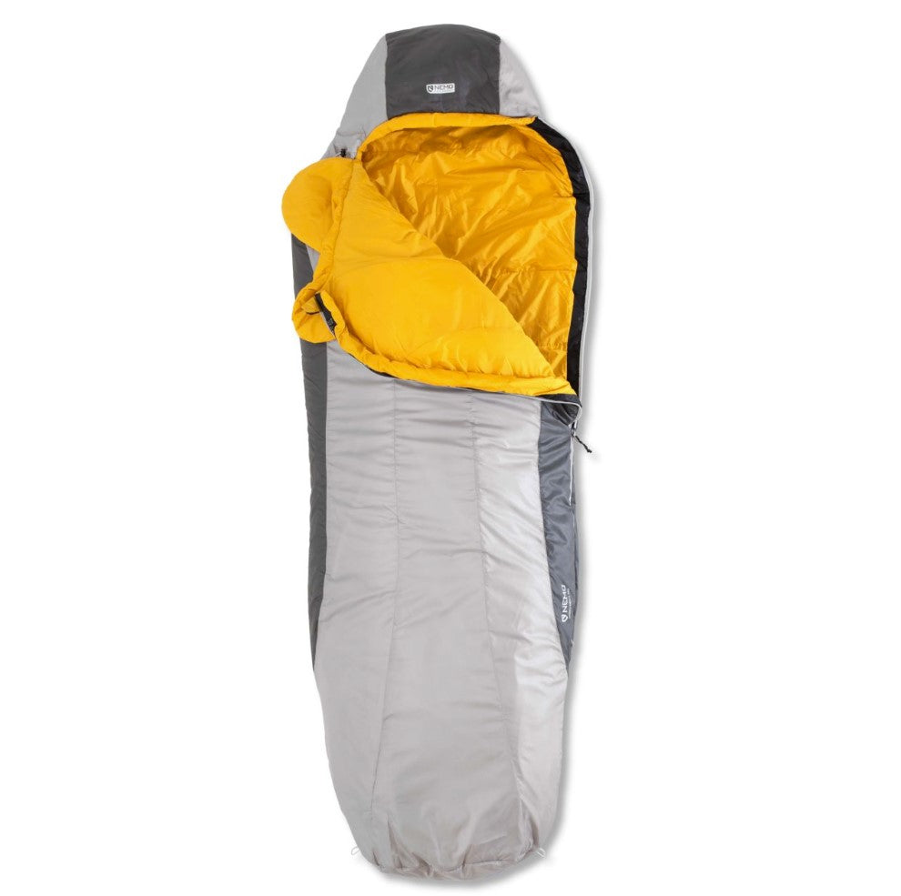Tempo™ blends roomy comfort with NEMO's space-saving Spoon™ shape for a relaxed, crowd-pleasing fit that packs smaller than a rectangular sleeping bag. With a generous cut at the elbows and knees, side sleepers can shift positions comfortably throughout the night. Insulated with synthetic Stratofiber™ fill, Tempo offers the best blend of moisture resistance, comfort, packability, and affordability. An integrated pillow pocket allows a jacket, extra clothes, or Fillo™ to be stuffed into the sleeve opening for extra comfort, while the Blanket Fold™ draft collar provides extra tucked-in comfort and temperature regulation mid-season. Left-sided zippers on the men's and right-sided zippers on the women's bags allow two Tempos to zip together for a double version of these favorite sleeping bags.