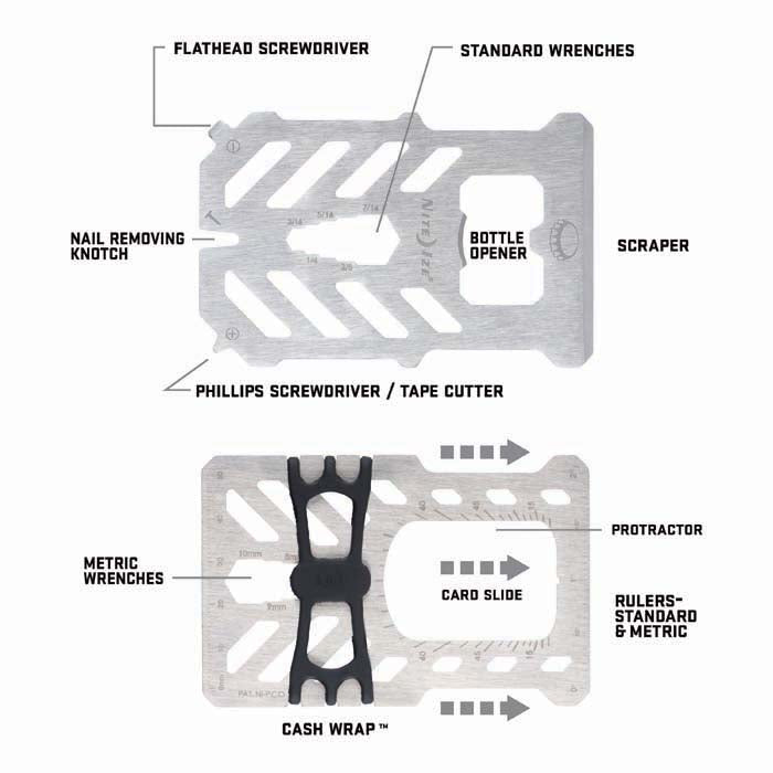 - Includes: Cash Wrap™ Strap, bottle opener, 5 standard-size wrenches, 6 metric-size wrenches, nail-removing notch, phillips screwdriver, flathead screwdriver, scraper, metric and standard rulers, & protractor