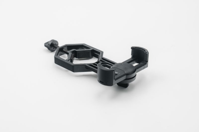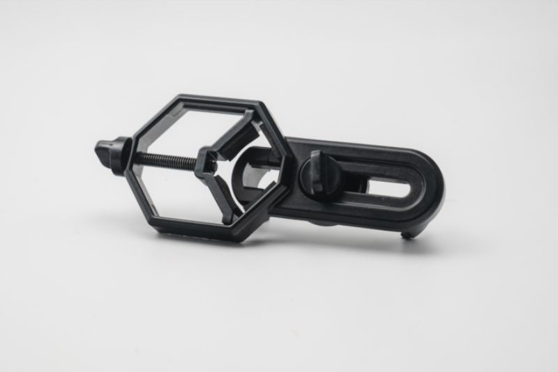 Aligns the phone lens with the binocular lens for photos and for videos. Reinforced cast aluminum frame keeps a tight grip on the binoculars, while spring loaded phone clamp, also of aluminum, holds the smartphone tight. Eyecup width between 24-46mm, which covers the spectrum of optics. Phone widths between 62-104mm will fit (iPhone 5 sans case is too narrow). Folds down to a small size that easily fits in pocket.