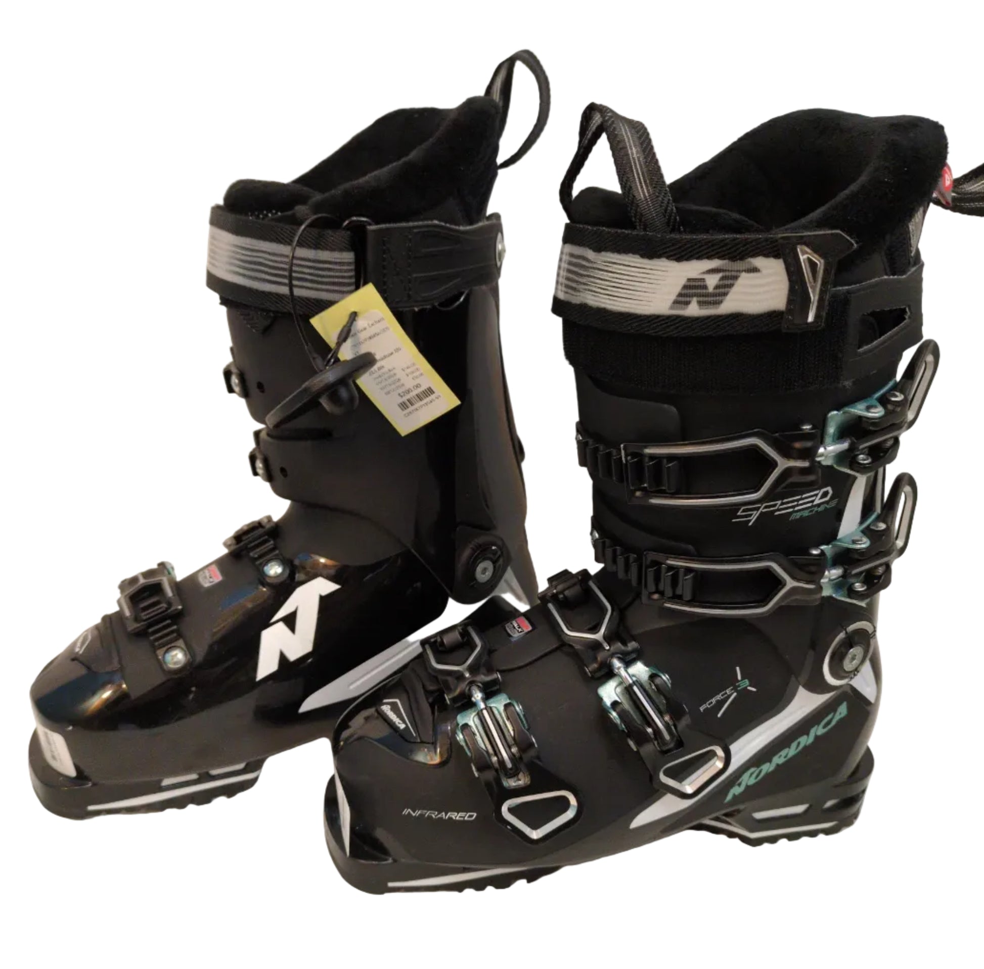 These Nordica Speedmachine 105 boots look brand new—barely a mark on them. Size 23.5 in pristine condition, ready to hit the slopes without showing a single run's worth of wear.