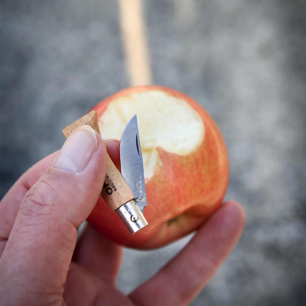 The No.02 is Opinel's smallest folding knife (since the discontinuation of the No.01 in the 1930's). Small in stature, but highly efficient, the keychain version of the No.02 follows you everywhere. This tiny knife is excellent for small tasks like opening letters or cutting papers. This is a very small knife (under 2 inches when folded!); please review the size before purchasing. Due to the size, this knife does not feature the Virobloc® safety ring.