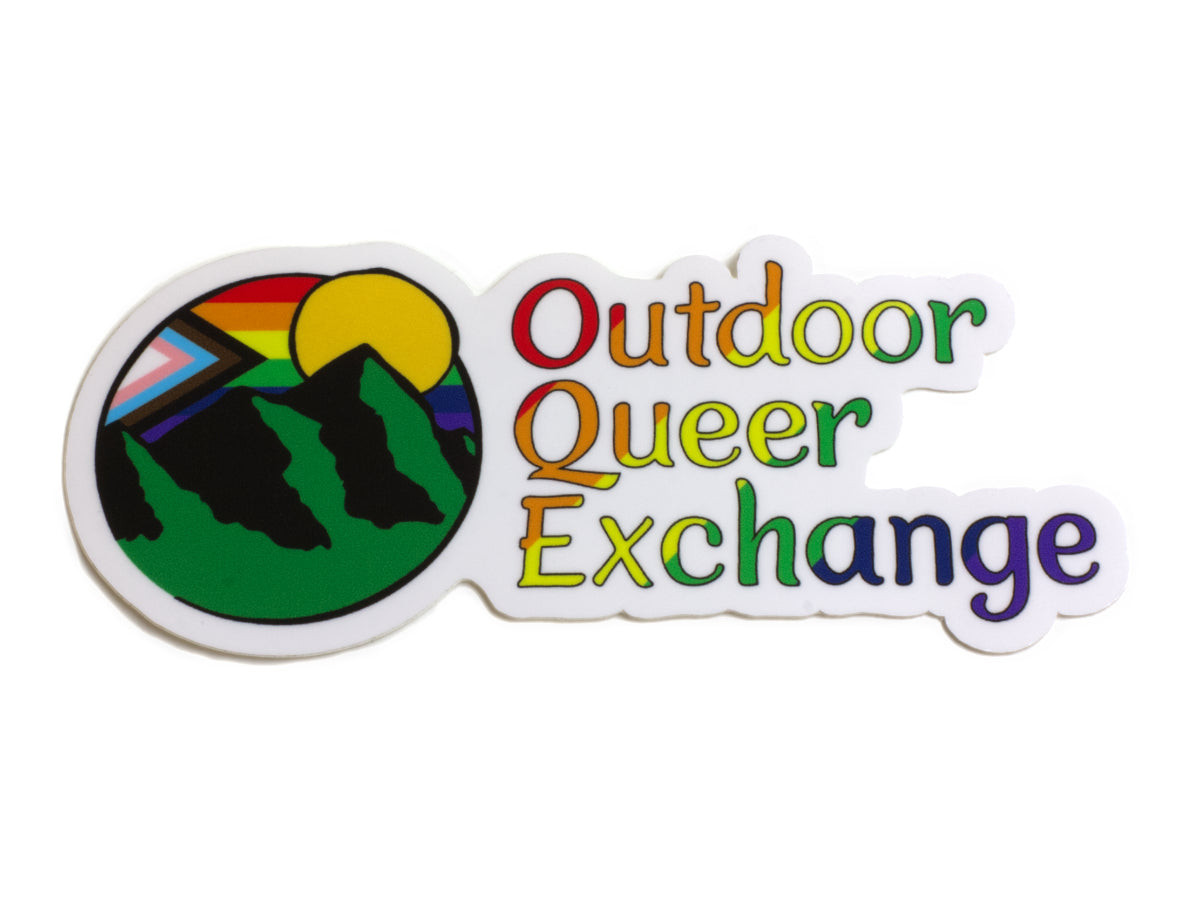 Pride outside! Its the "Outdoor Queer Exchange" sticker—fit for outdoor enthusiasts of all stripes! All proceeds from Outdoor Queer Exchange stickers go to benefit Outright Vermont. Your purchase will support efforts to build a Vermont where LGBTQ+ youth have hope, equity, and power.