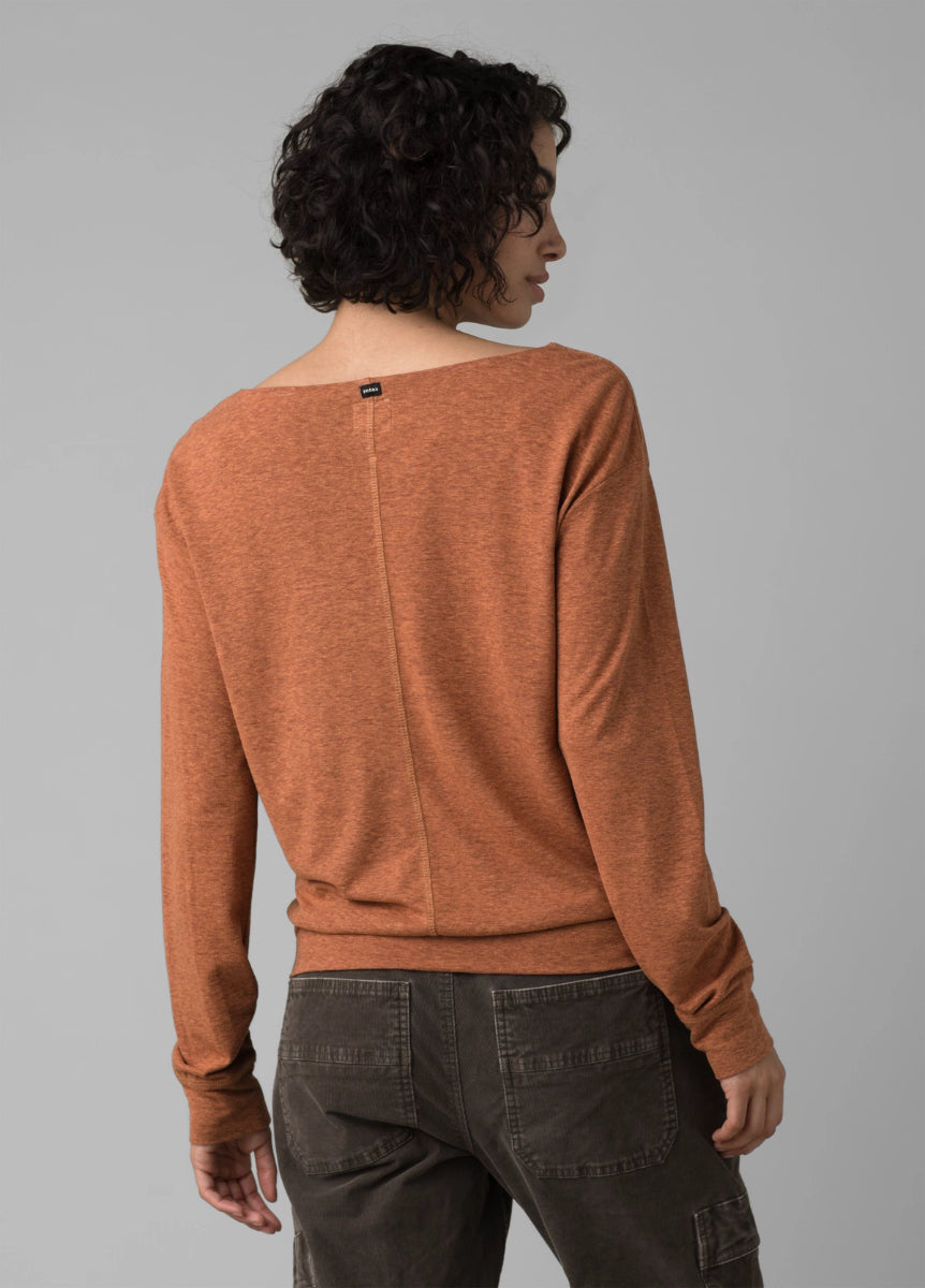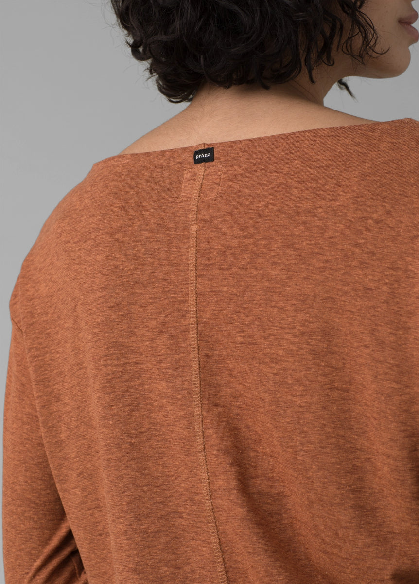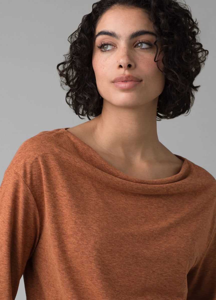 The Prana Women's Cozy Up Aires Top will be so handy, you won't have time to wait for it to come out of the wash. The banded bottom, which keeps it in place, and the boatneck with dropped shoulder styling elevate this long sleeve from your average layer. What's more, you can enjoy that well-loved, pre-broken-in feeling from wear number one thanks to the bestselling Cardiff fabric. With naturally bacteria-resistant hemp, this women's top makes everyday outfitting easy.
