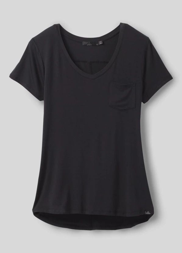 - Short sleeved v-neck pocket tee silhouette with back seam details