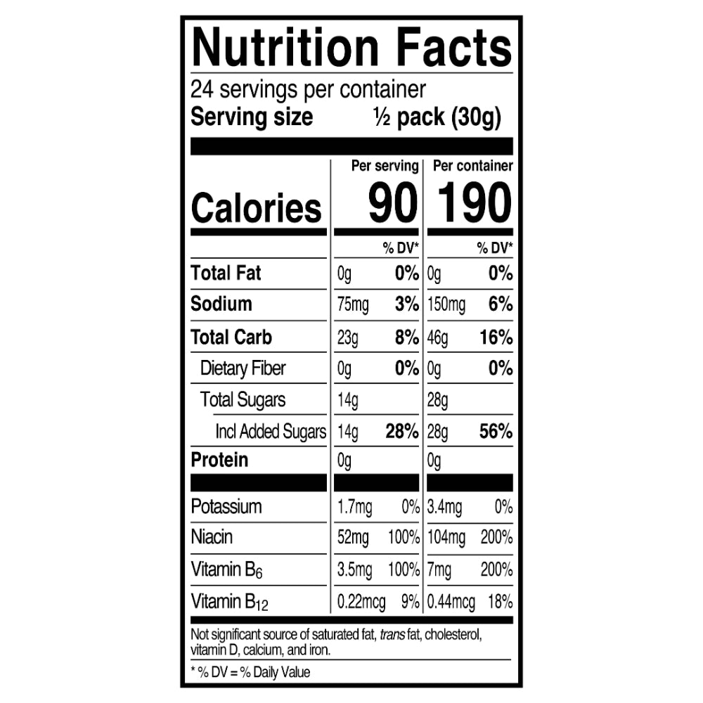 - Cran-Pomegranate Ingredients: Organic Tapioca Syrup, Organic Cane Sugar, Organic Tapioca Syrup Solids, Water, Pectin, Potassium Citrate, Citric Acid, Organic Natural Flavor, Ascorbic Acid, Organic Black Carrot Concentrate (color), Organic Sunflower Oil, Vitamin B3, Organic Fruit Blend (apple (apple, rice flour), acai, blueberry, pomegranate fruit extract), Salt, Organic Carnauba Wax, Vitamin B6, Vitamin B12.