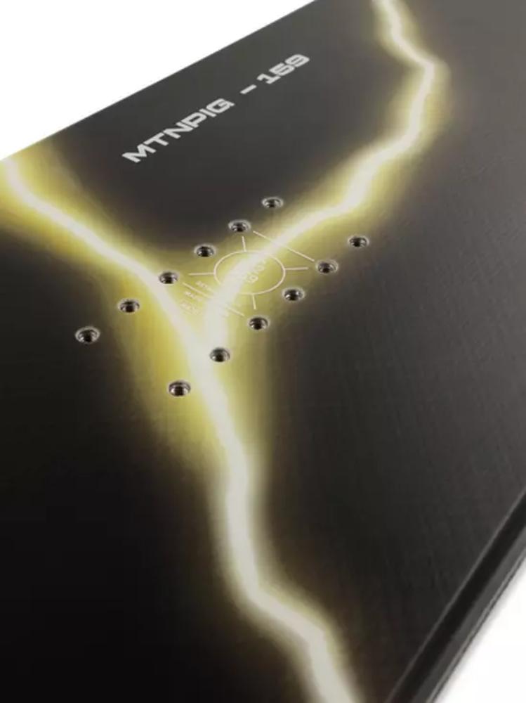 Designed for high-speed turns and the most aggressive of the Pig series boards, the MTNPIG features split tail tech that allows for a more dynamic turn shape and board flex through turns. Ride the MTNPIG in your standard board length—unlike the rest of the Pig series, Ride doesn't suggest sizing down on this model. The half-moon split tail shape helps it sink in deep snow while providing a long effective edge, increasing overall edge hold for sketchy situations. Tapered Linear Quadratic sidecut allows for smooth turn initiation and powerful support through the turn without losing grip. Carbon Slim Walls reduce weight, increase damping, increase energy transfer to enhance response and stability while Carbon-Infused Glass provides extra pop. The MTNPIG is running wild and fast through the mountains, growing fat on powder, and should only be approached by an advanced rider.