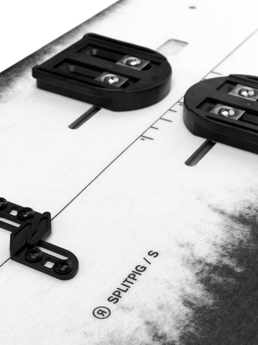 The SPLITPIG is a WARPIG shape that breaks in half so you can walk up mountains and thrash every feature on the way down. The flex of a WARPIG with a Carbon Race Base and a touch of added camber for the climb. Featuring a brushed nylon topsheet to reduce weight while shedding snow. The Split Performance Core features a Slimewall ® center sidewall for maximum vibration dampening. The Channel Binding Mounting System allows for more stance options and a much easier setup than your standard split. Includes standard canted mounting pucks compatible with most splitboard bindings on the market. Forget cutting skins, the SPLITPIG comes with custom fit Pomoca Climb 2.0 skins. We'll cut to the chase: SPLITPIG will allow you to access more off-piste locations in the mountains.