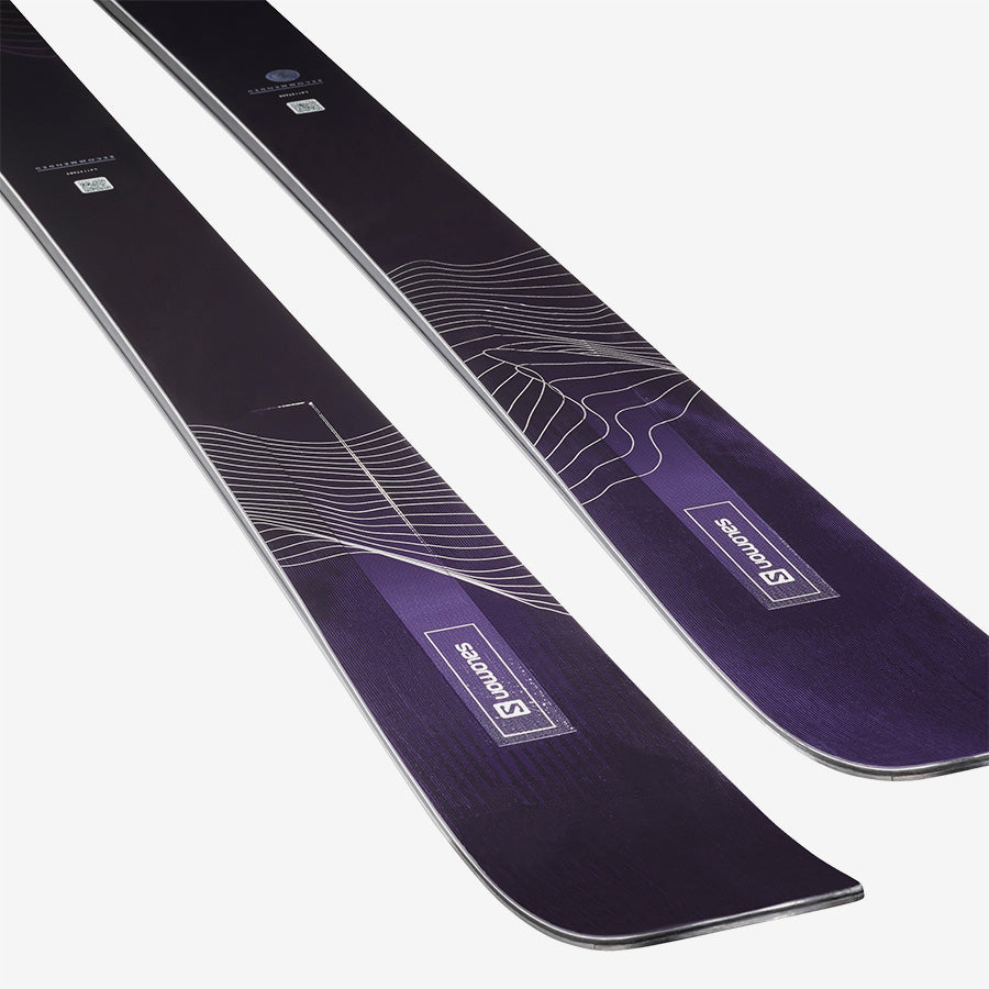 - Metal Twin Frame: A titanal top core TI layer provides improved stability, while the recessed windows, strategically placed in the tip and tail, frame Salomon's proprietary C/FX fiber layer to help release torsion for increased maneuverability and dampening.