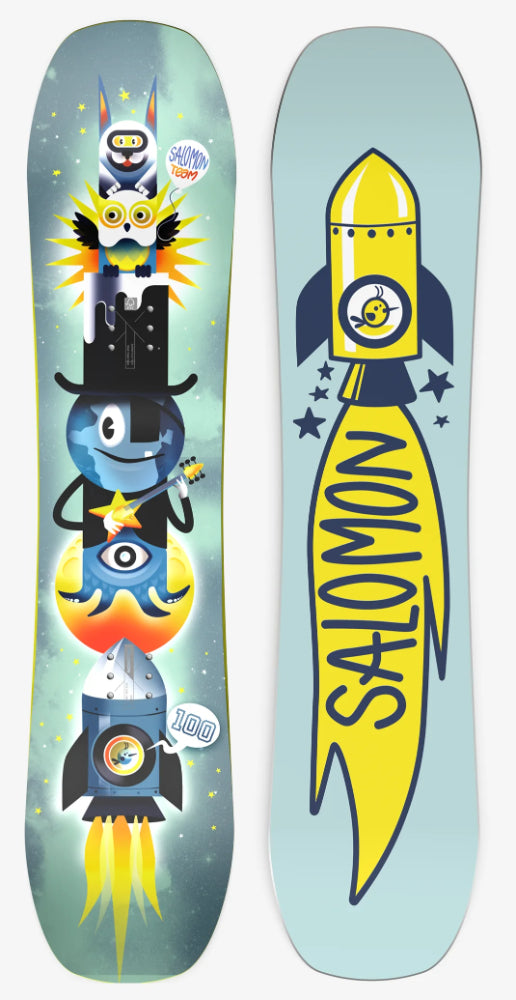 Salomon's Team Package is a complete board and binding package, ready to ride with the Goodtime XXS Binding and a removable leash that allows for parental uphill towing and downhill safety and control. A Super Flat profile and concave Bowl Skate Base make for easy turning on day one, with Bite Free Edges to ensure fewer hang-ups and fast progression.