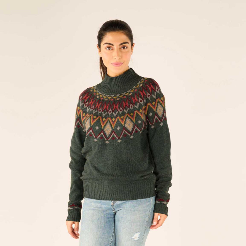 Sherpa's Indu Eco Mock Neck is a wool blend, casual sweater for exceptional warmth and effortless style. The mix of merino wool, Alpaca, viscose, and recycled nylon, combines superior warmth, with moisture-wicking and natural antimicrobial properties. The ribbed mock neck provides additional coziness, whilst ribbing at the cuffs and hem enhances the fit. A striking horizontal geometric pattern evokes traditional Nepali Dhaka design, enhancing a simple look when worn with a pair of jeans or leggings. Harnessing modern production and natural fabrics, the Indu Eco Mock Neck is a timeless style, for everyday wear.